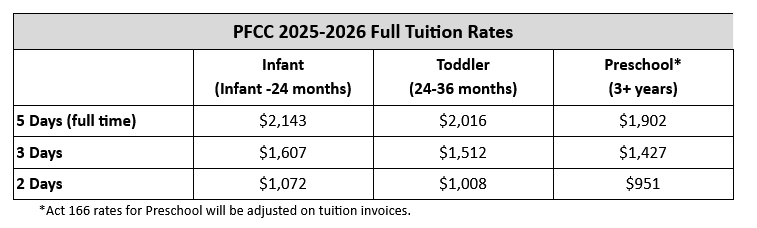 Pine Forest Children’s Center’s Board of Directors is evaluating and planning our 25/26 school year budget which includes finalizing tuition rates. While our published rates are the FY25 Child Care Financial Assistance Program Rates, our Board, in partnership with the Executive Director, are working on a scholarship model similar to our current tuition plans. The goal is to have these rates published by 7/31/25 for them to go into effect on 9/1/25.