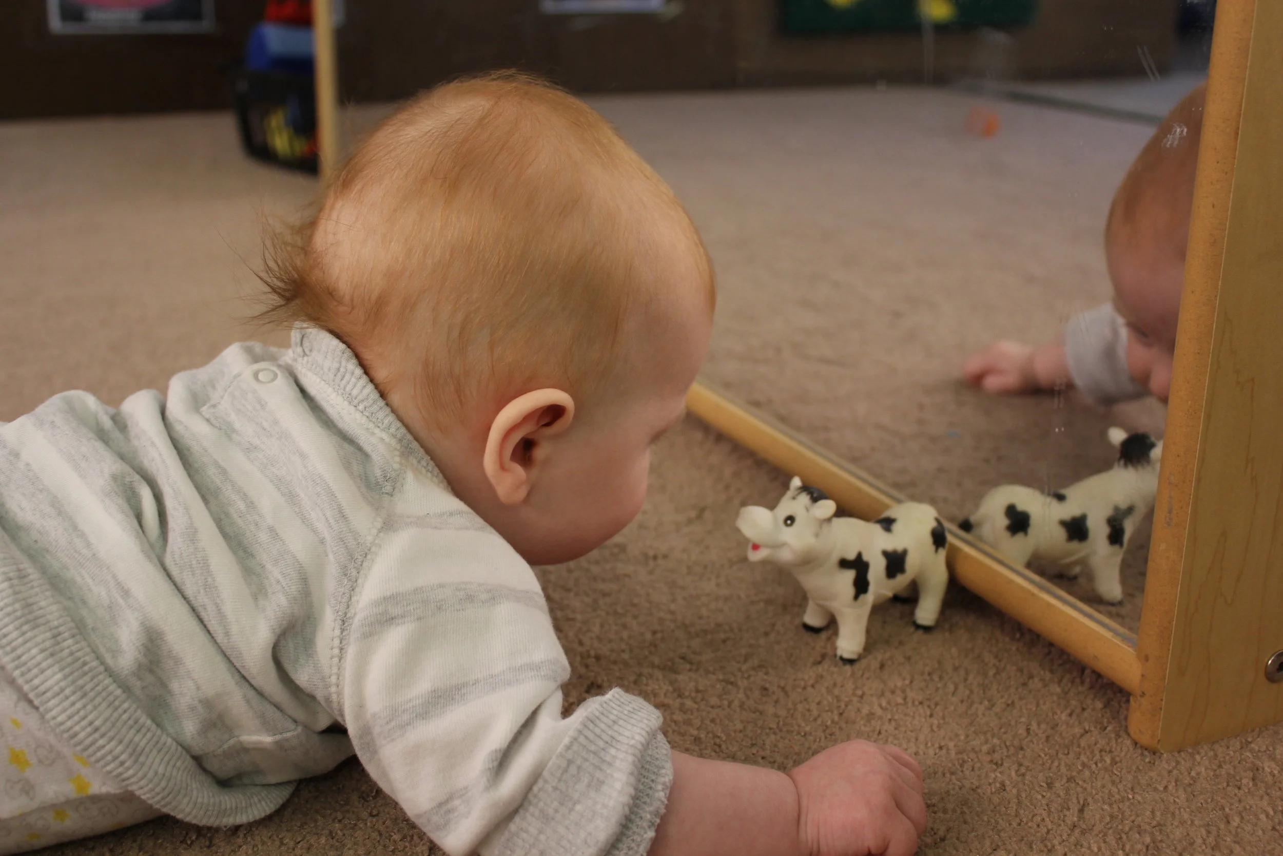 Our infant program is divided into two classrooms in order to honor the growth and development that happens within the first year of life. The younger baby and older baby classrooms each have two teachers who support and nurture our youngest community members.